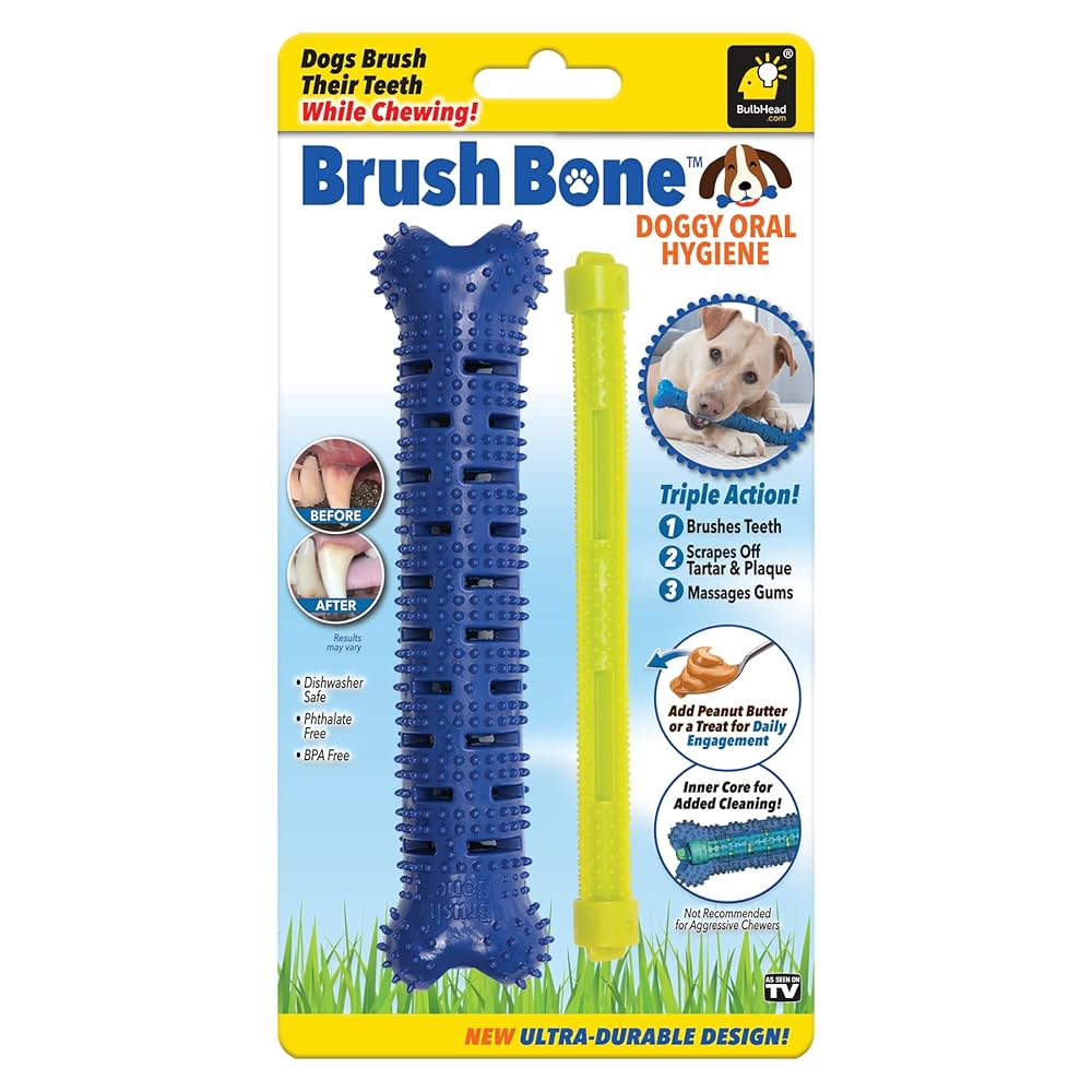 Modo de uso: Entrega el Chew Brush a tu mascota como juguete. Al morderlo, las cerdas internas limpian los dientes y las protuberancias externas masajean las encías. Se puede usar con pasta dental para perros o solo. Supervisar durante el juego y retirar si se daña.