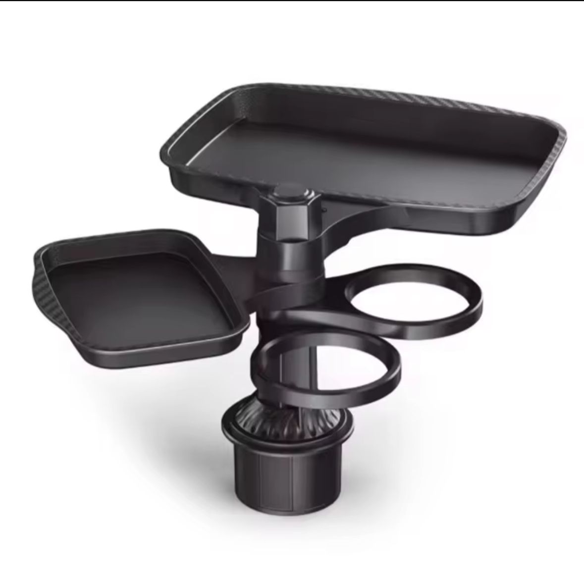 El objeto en la imagen es una bandeja para coche con portavasos, diseñada para colocarse en el portavasos de un vehículo.